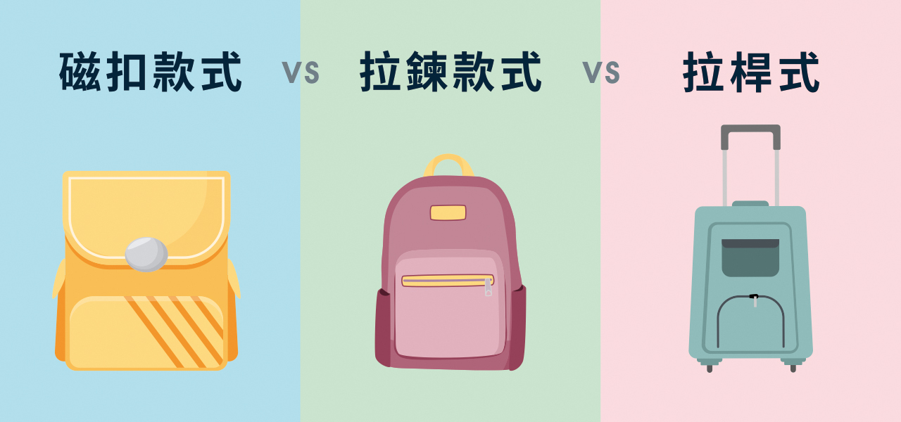 磁扣款式 vs 拉鍊款式 vs 拉桿書包