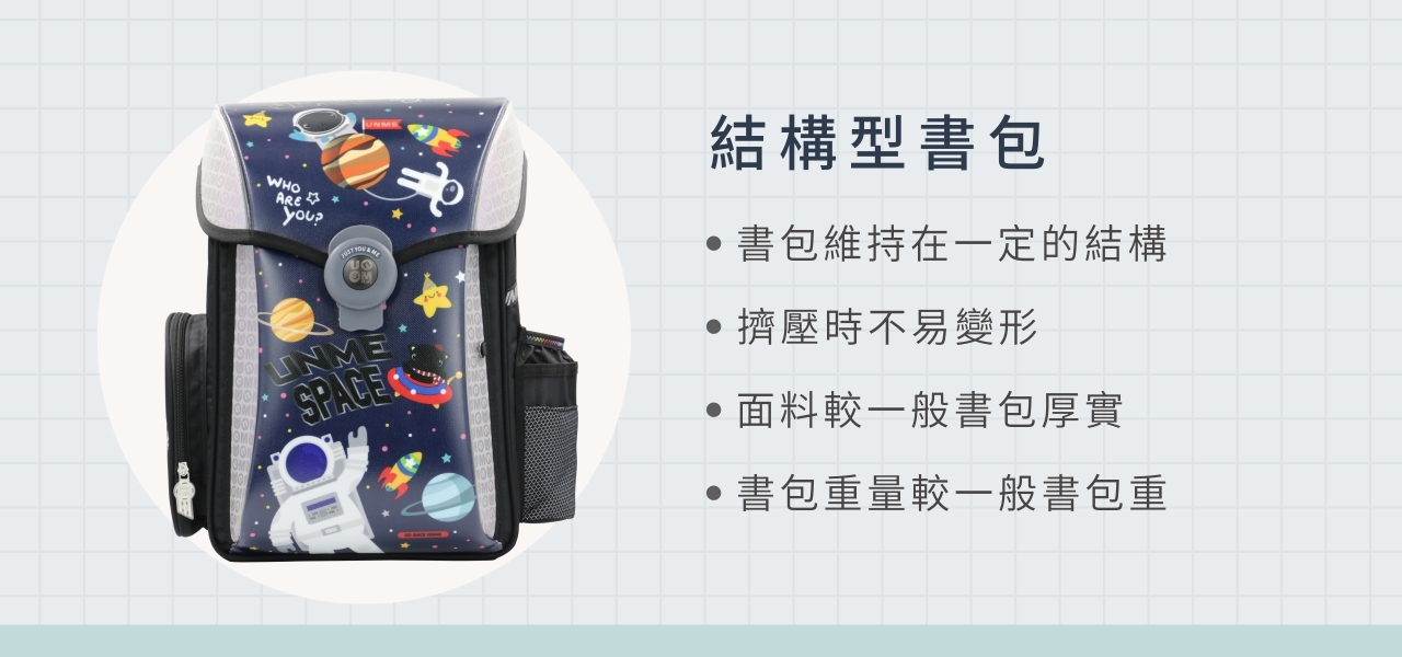 材料較為厚實,因需要維持書包整體的結構,會使用較厚實的材料來支撐整體書包,故整體重量上來說會較重一些呦!