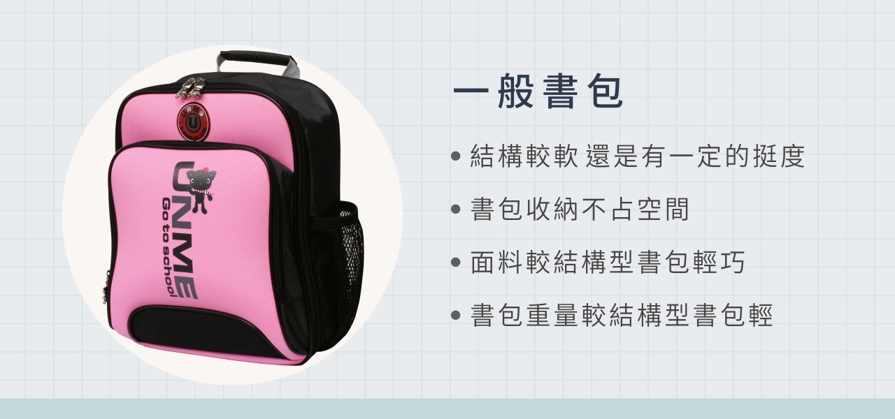 書包整體結構沒有項硬挺式書包需要更厚實的材料來去支撐,相反地在重量上就會比硬挺式書包較輕些。