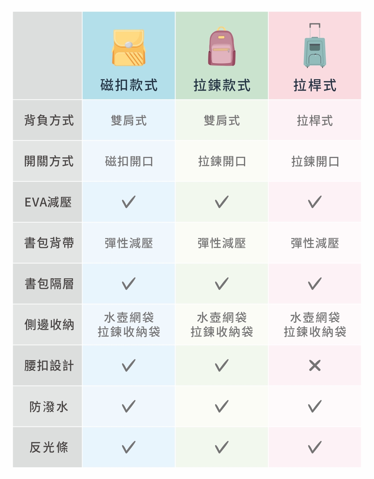 以下U編歸納磁扣書包、拉鍊書包、拉桿書包的比較表,讓你可以一次看清楚解開疑惑!