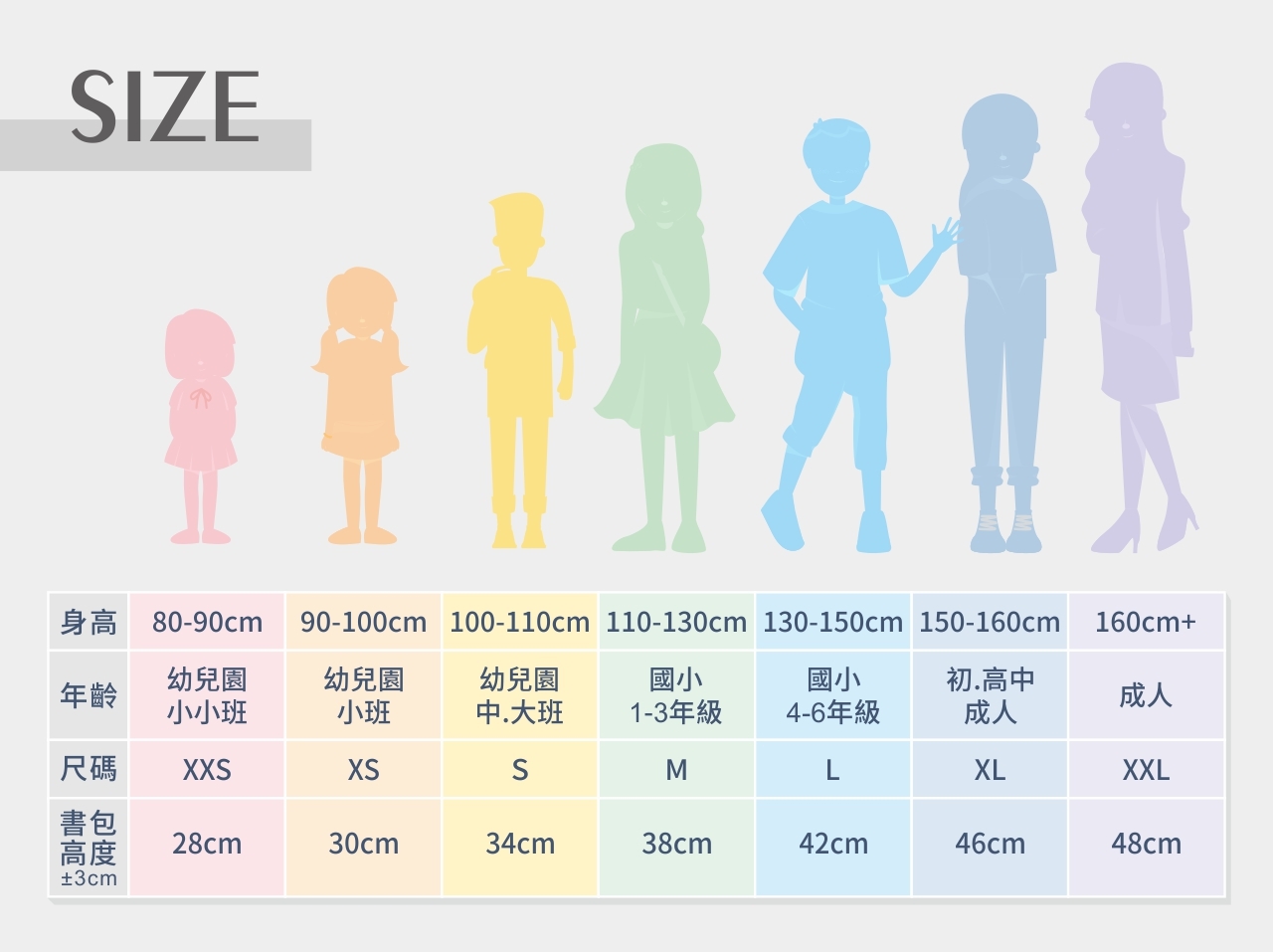 相較於體型選擇較難知道書包適不適合,我們可以先從「身高」作為書包的第一階段篩選,可以將130cm做為低年級及高年級的分水嶺,如孩子在130cm以下可以從低年級適用的款式來做選擇,反之130cm以上就可以從高年級款式來挑選喲!