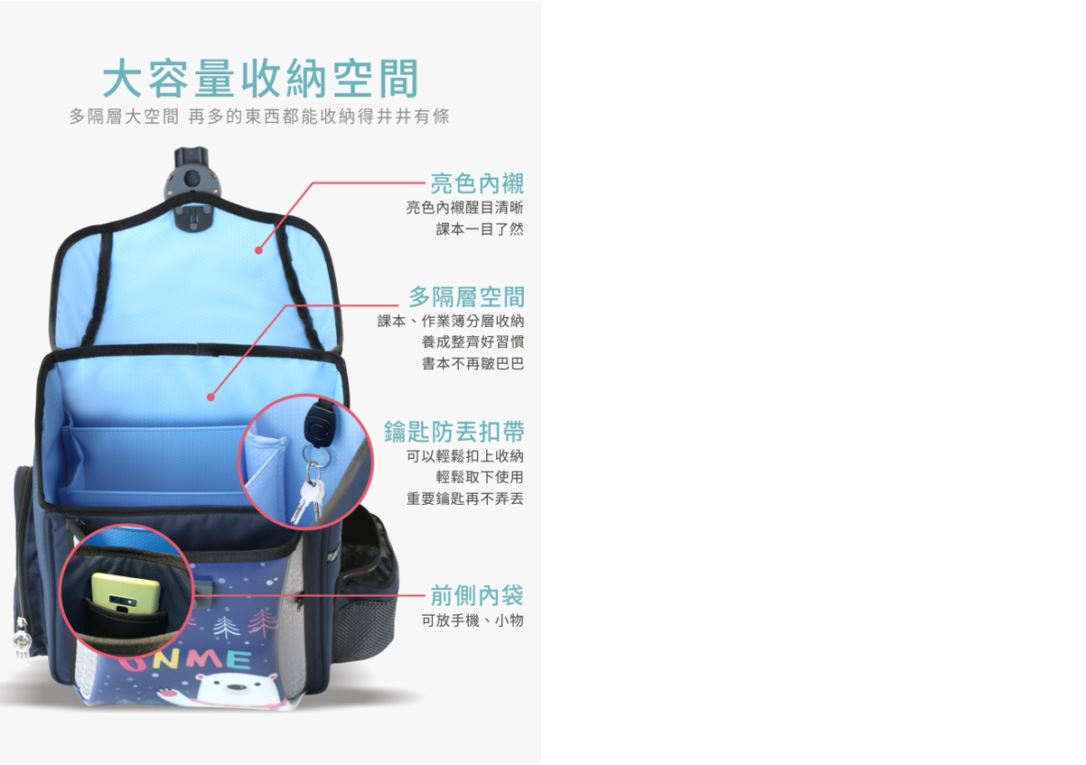 書包基本上都會做兩層隔層,有些書包除了兩個隔層之外,也有設計彈性伸縮袋或是網袋部分增加隔層分類,這邊要記住一個小撇步「重的書往後放;輕的書往前放」,重心靠近背部搭配書包的護脊設計,才能有效地達到分壓的效果呦!