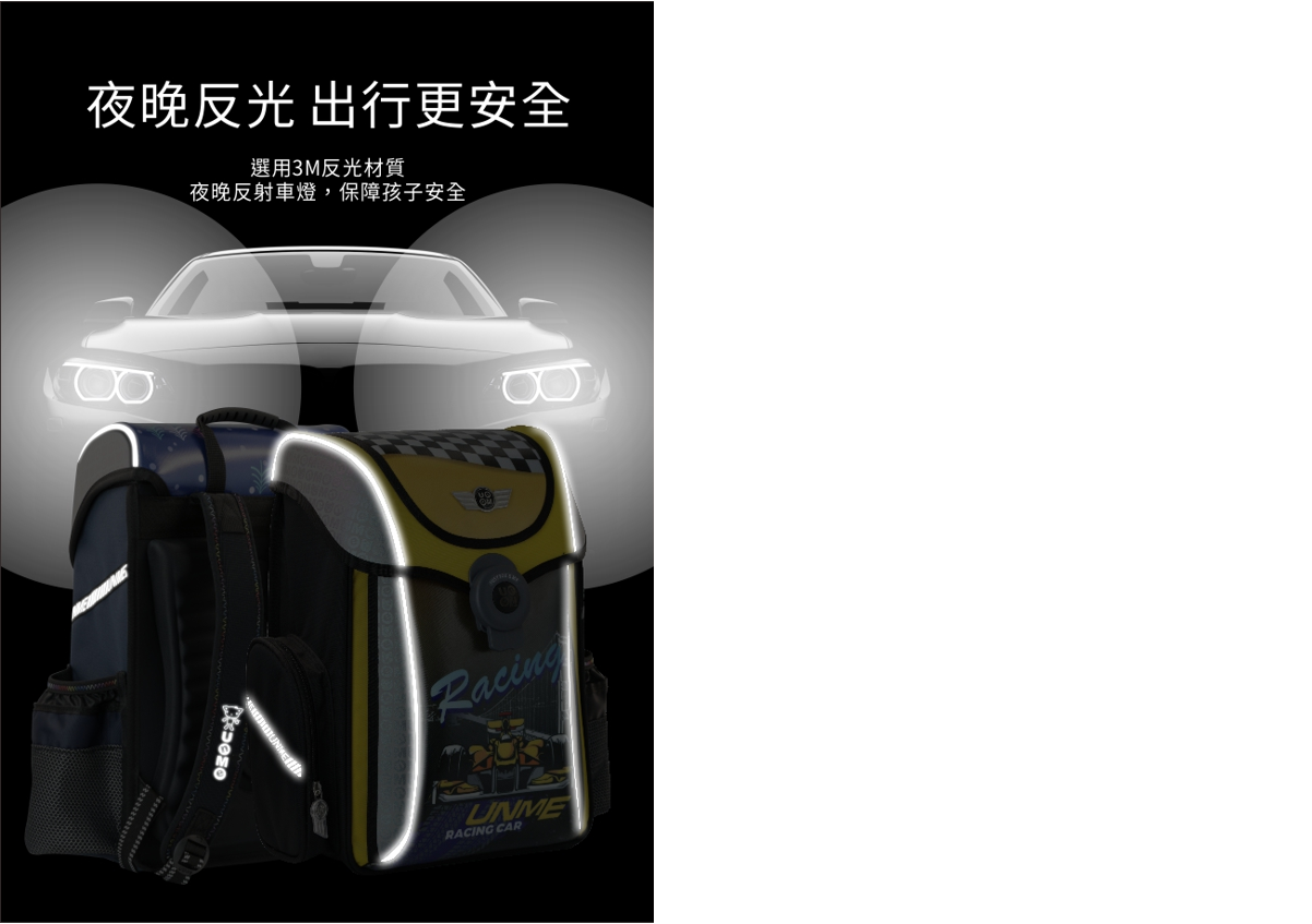 360度全方位反光條設計,讓孩子背負書包時前後左右皆可以反射車燈,讓車上駕駛知道孩子正在行走而提高警覺,提高孩子的夜晚行走安全!