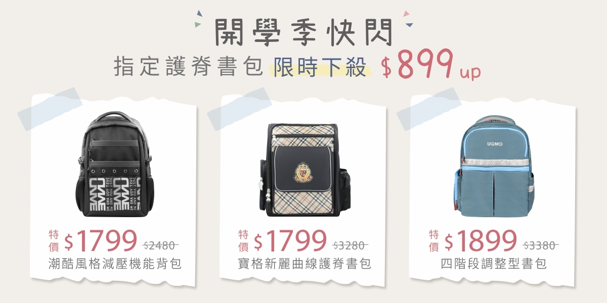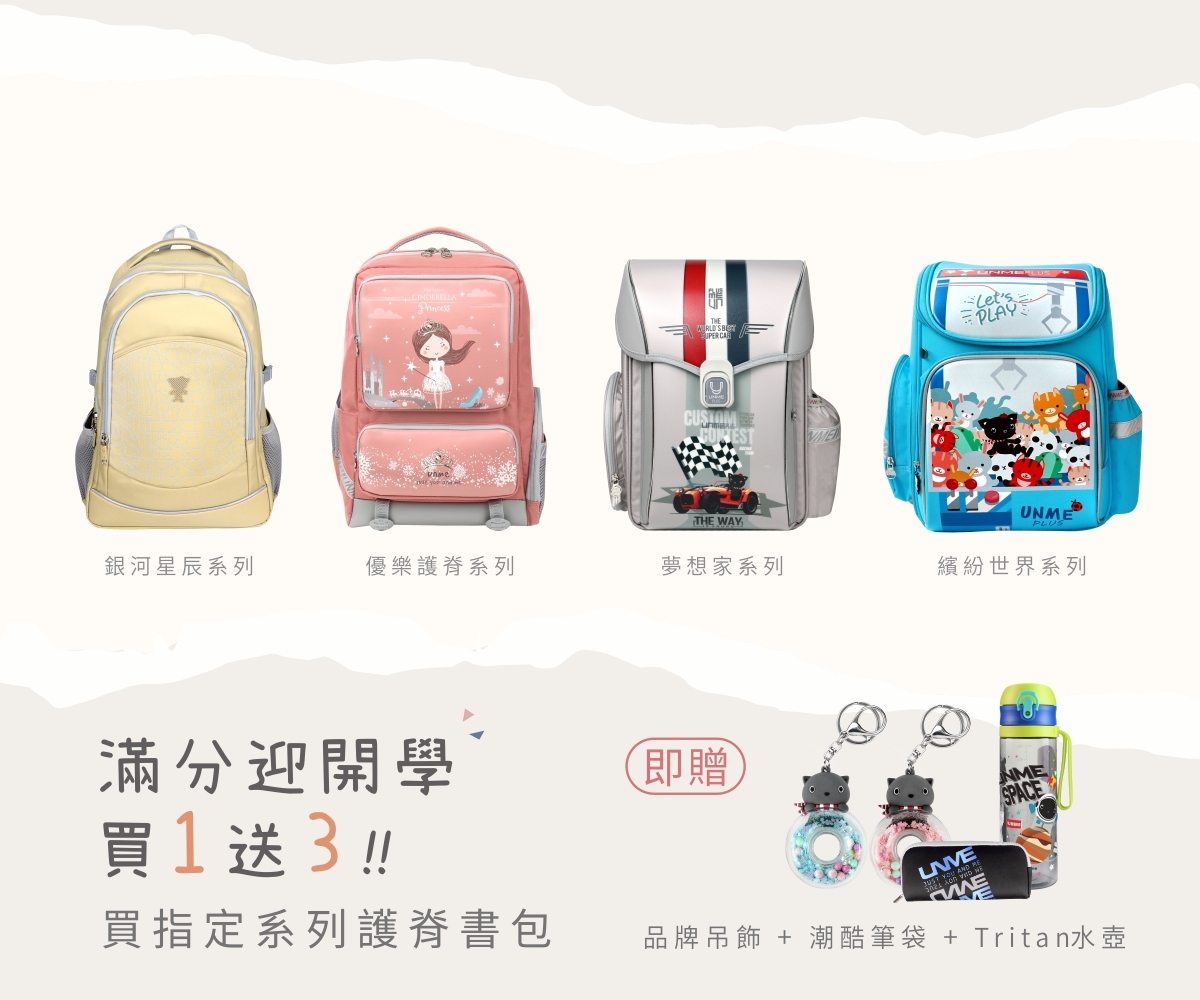 任選護脊書包,再送品牌吊飾+Tritan水壺+筆袋。