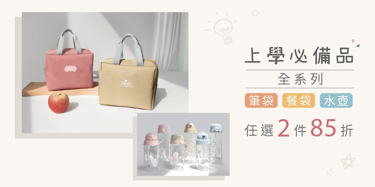任選學用品 - 餐袋、筆袋、水壺 2 件 85 折。