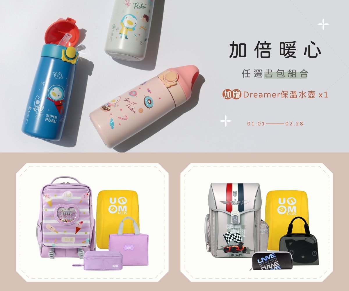4. 任選書包組合,再送Dreamer不鏽鋼吸管保溫水壺500ml。