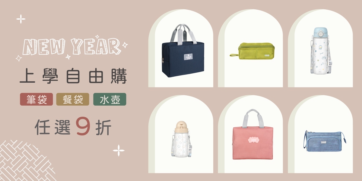 任選學用品 - 餐袋、筆袋、水壺 9 折。