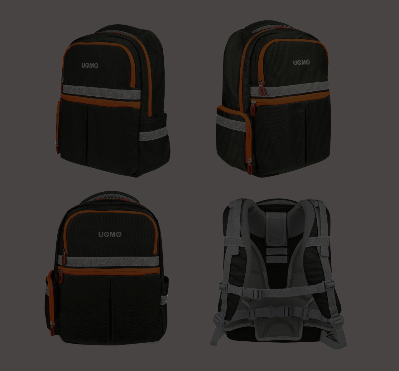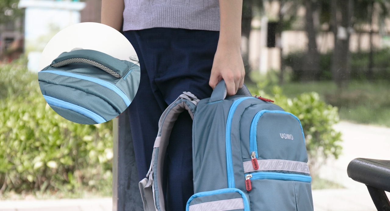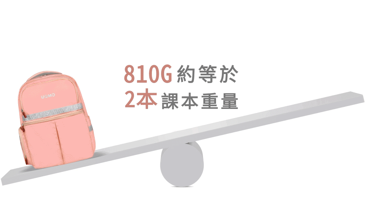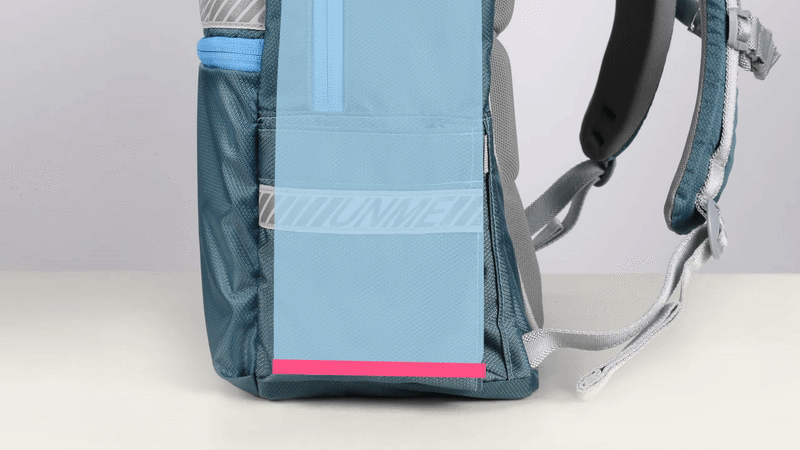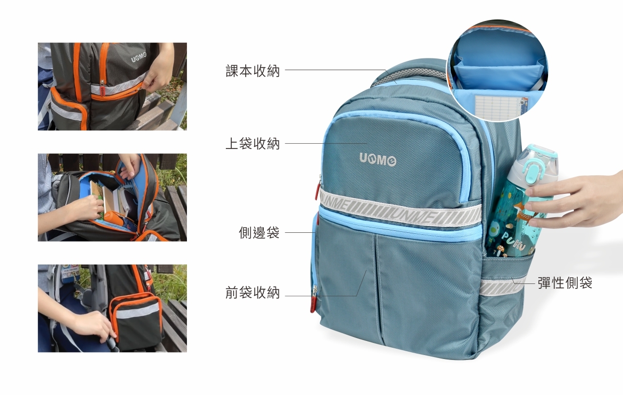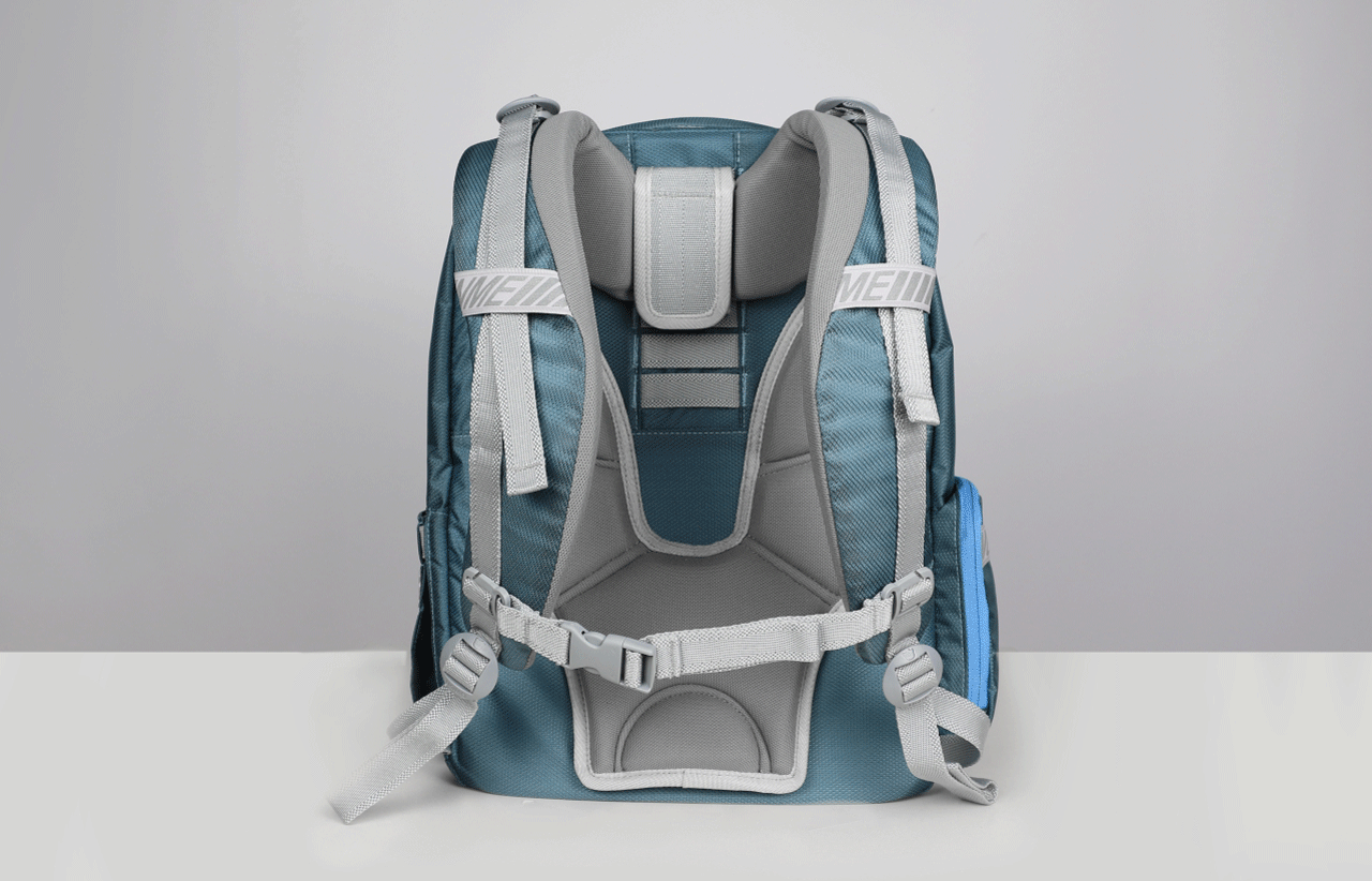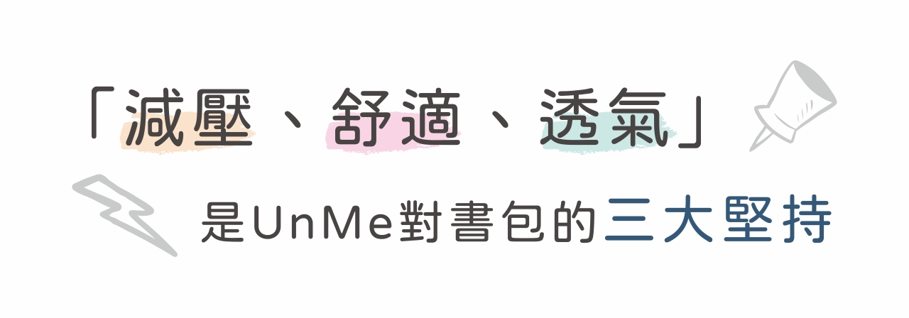 對於學童書包的護脊功能, UnMe 團隊皆遵循「減壓、舒適、透氣」三大原則來設計與製作。以雙肩揹帶輔以胸扣、腰扣達成五點式分壓,減輕孩童揹書包的負擔,達到「減壓」效果。