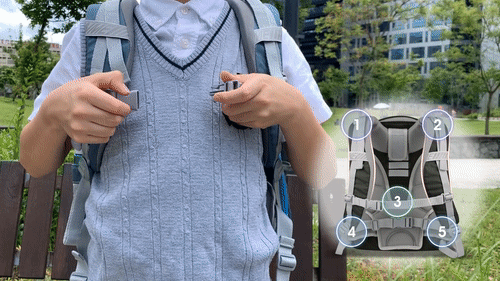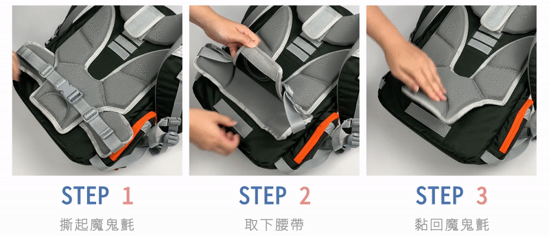 調位包也觀察到許多孩子可能因為書包重量不是很重的情況下,不願使用腰扣,因此腰扣的可拆式設計能更輕量化書包的結構重量。