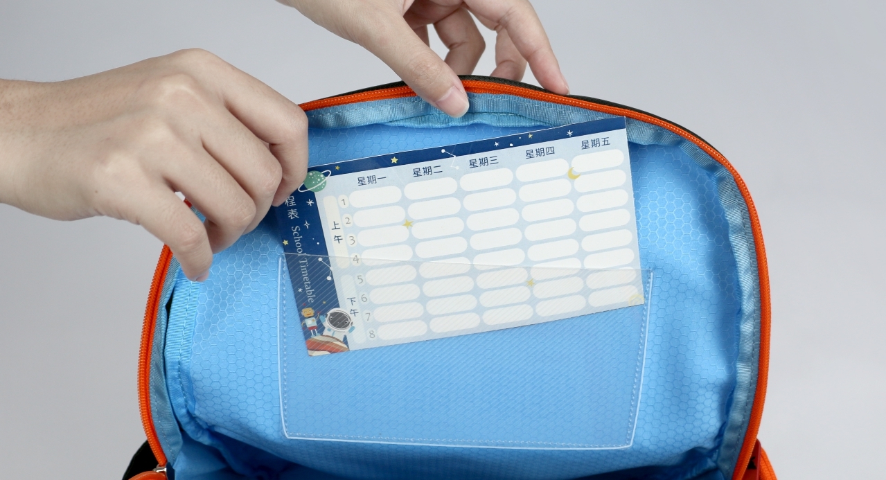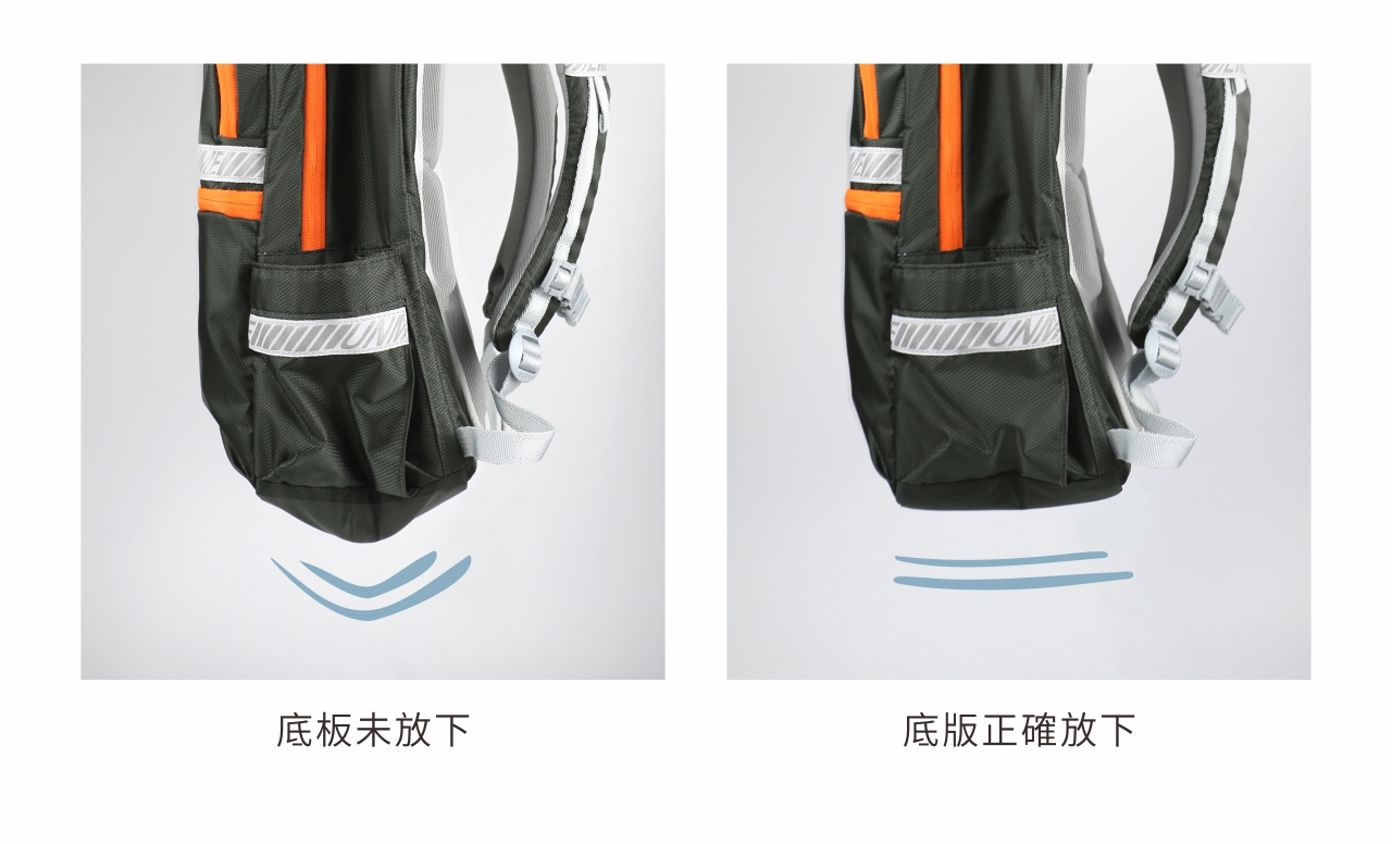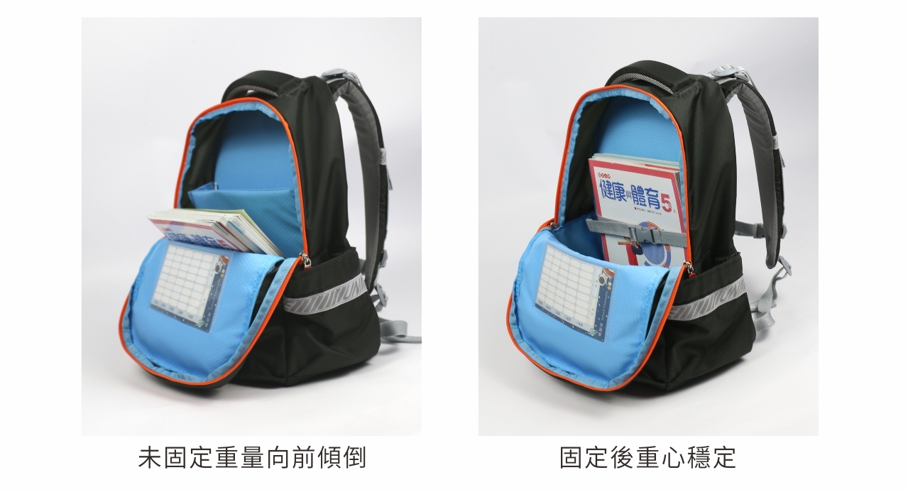 活動式底板除了能讓書包站好,還能使書本重量平均分散於底部。孩童背負時不會因為集中於某點的下壓力量徒增不適感。
