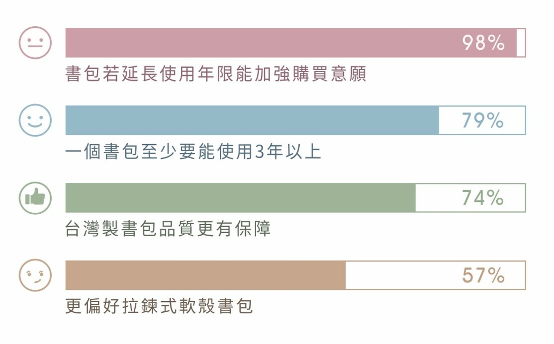 藉由徵集上千份問券,我們統整了有購買書包需求的家長們,對於護脊書包除了護脊和輕量之外,更偏好的書包特色與功能。